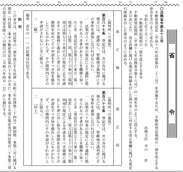 不動産登記規則の改正がされました。 ■官報 kanpo.go.jp/20251030/20251… (PDF) 令和8年4月1日から所有権の登記名義人の名変登記が義務化されるのに伴い、過料の手続(登記官から裁判所への通知)の規定を整備するものです。 施行日:令和8年4月1日 pic.x.com/cvShz1UHPz