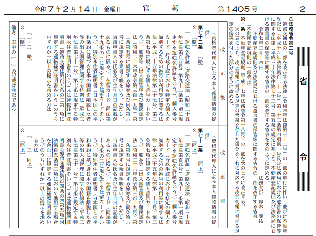 不動産登記規則(および法務局における遺言書の保管等に関する省令)の改正がされました。 ■官報 kanpou.npb.go.jp/20250214/20250… (PDF) 施行日:令和7年3月24日 資格者代理人による本人確認情報の作成の際の本人確認の提示書類についての改正です。 道路交通法の改正によるものです。 pic.x.com/vLieYCc8WJ