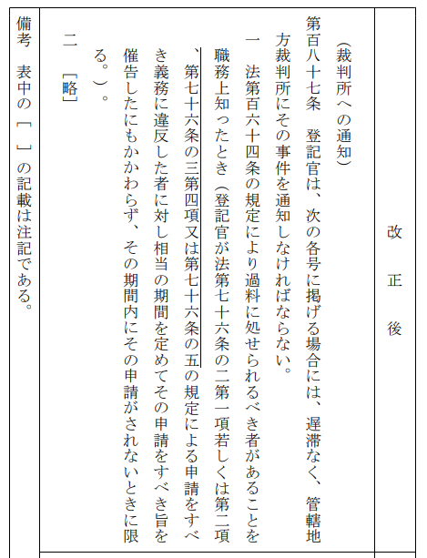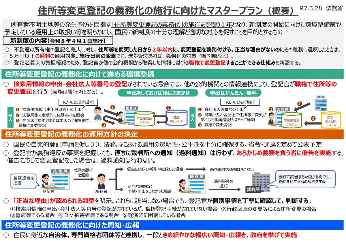 不動産登記規則の改正が検討されています。 ■パブリック・コメント public-comment.e-gov.go.jp/pcm/detail?CLA… 名変登記の義務に違反した者についての登記官から裁判所への通知の規定です。 令和8年4月1日施行の名変登記の義務化に向けた法務省の「マスタープラン(概要)」は、3枚目の画像をご覧ください。 pic.x.com/aOuxObUyiK