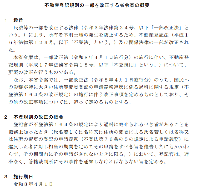 不動産登記規則等の一部を改正する省令案に関する意見募集 所有不動産記録証明制度の開始によるもの 施行期日:令和8年2月2日 public-comment.e-gov.go.jp/pcm/detail?CLA…