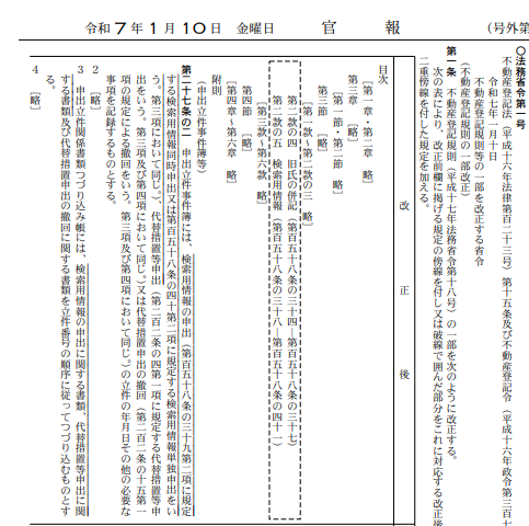 こちらの不動産登記規則の改正がされました。 ■官報 kanpou.npb.go.jp/20250110/20250… 令和8年4月1日施行の「登記官の職権による住所等変更登記」のために、自然人についての「検索用情報」の申出手続等を定める改正です。 施行期日:令和7年4月21日 pic.x.com/DiqETspXJL x.com/matumoto_masa/…