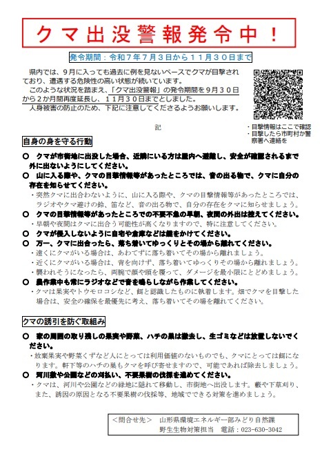 【人身被害発生!ツキノワグマの出没に注意!】 本日早朝、米沢市李山地内で、散歩中の男性が、クマに襲われケガをする事案が発生しました。 県内では今年12人目の発生になります。 早朝・夜間はクマが活発に活動する時間ですので、 不要不急の外出を控えるなど、特に注意してください。 pic.x.com/hSvAVeKCIG
