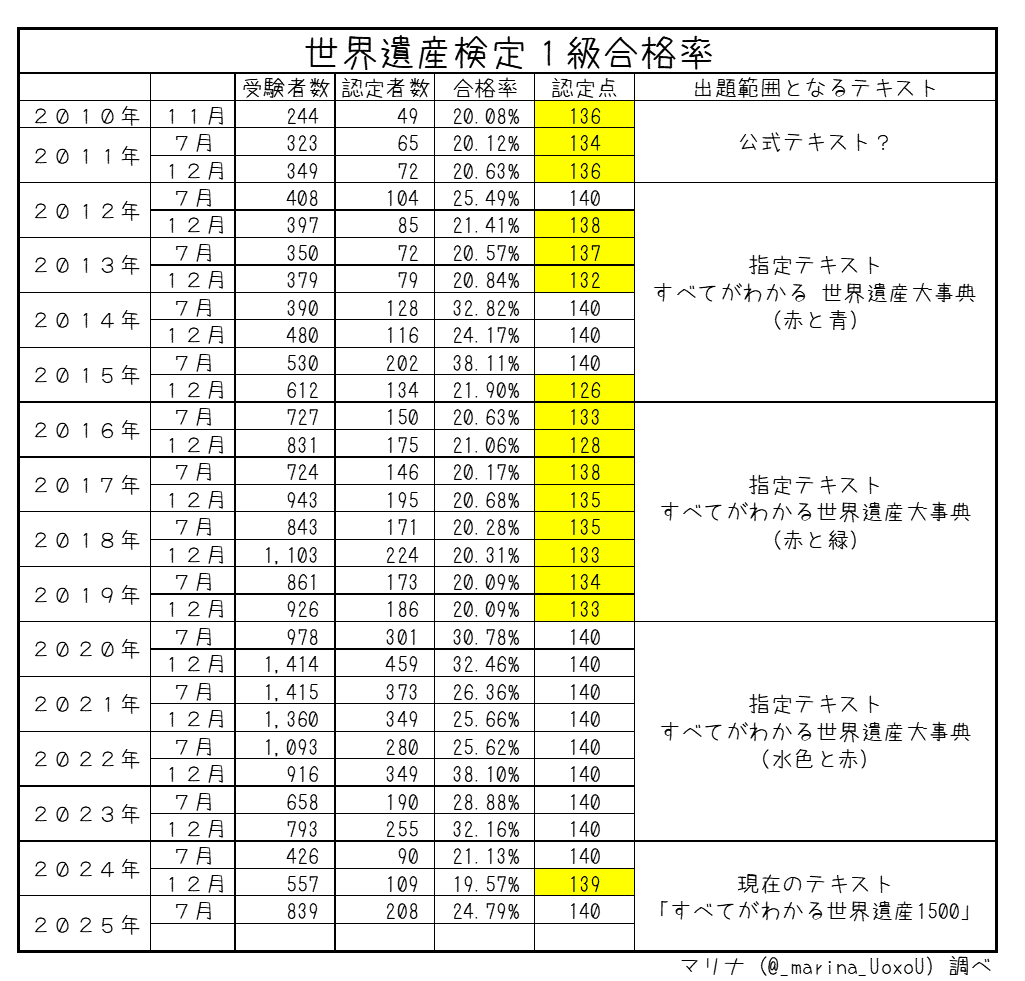 世界遺産検定1級合格率推移(~現在まで) pic.x.com/Cnd2UnKund