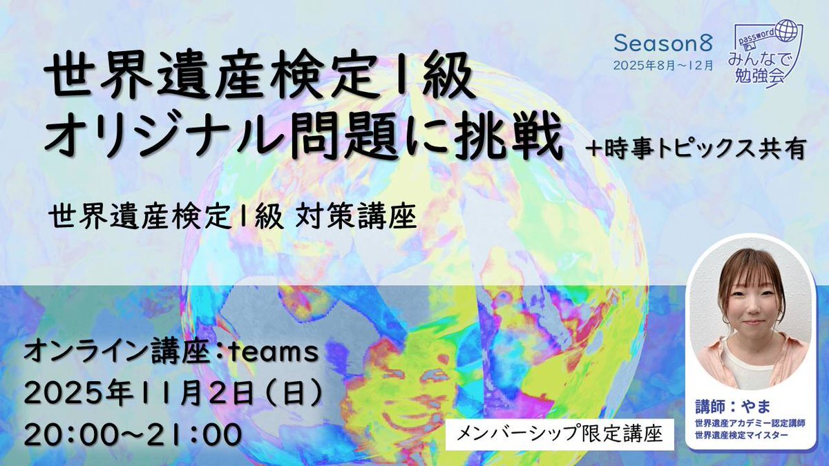 #世界遺産検定 1級受験者集合! \ 🌎️第2回!オリジナル問題に挑戦 & 時事共有📣 📅11/2(日)20~21時 📍担当講師:やま(世界遺産アカデミー認定講師/世界遺産検定マイスター) 💻オンライン(Teams) ▼メンバーシップ登録後に参加可 youtube.com/channel/UC_xyZ#世界遺産検定1級 pic.x.com/uLjHzab1Zy