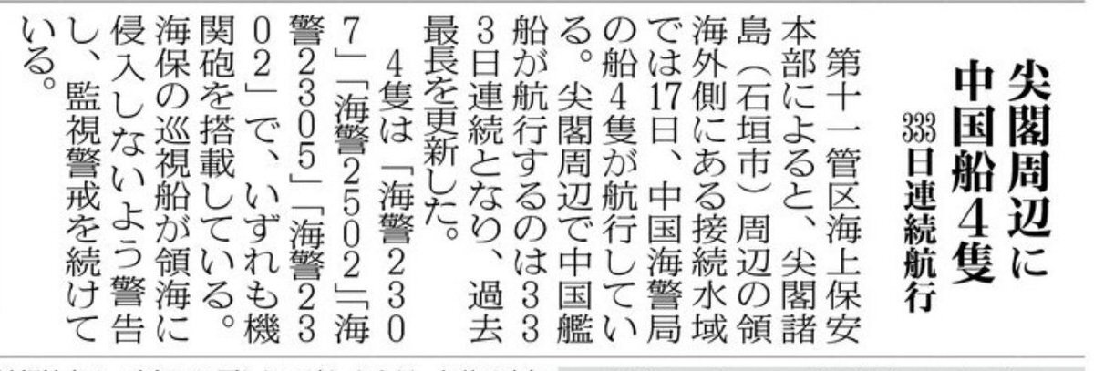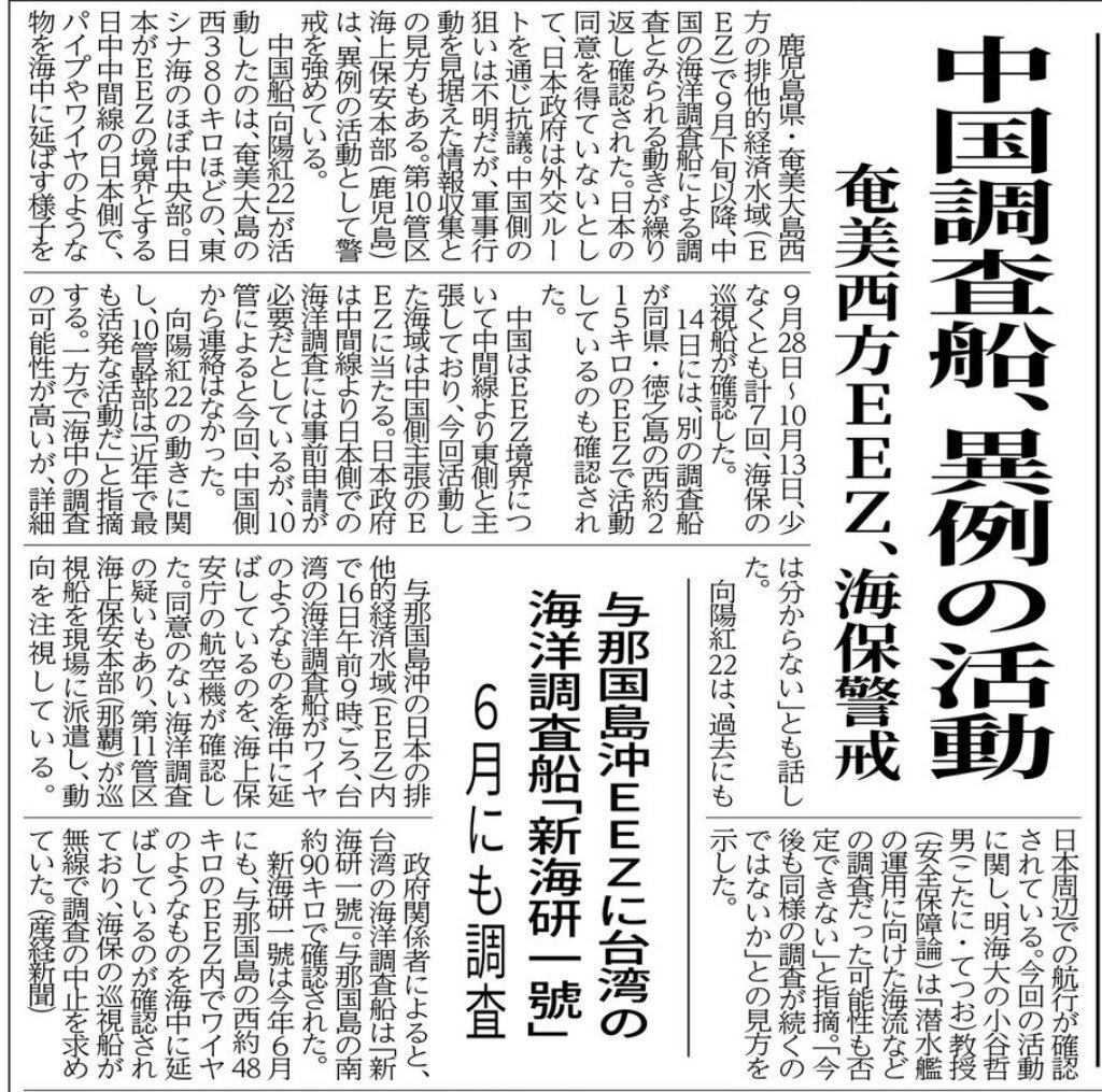 中国調査船、異例の活動 奄美西方EEZ、海保警戒」 「尖閣周辺に中国船4隻333日連続航行」 八重山日報 日本政府の甘い、緩い対応が問題。 新しい政権にはもっと毅然とした対応を。 pic.x.com/c8OzCZk13A