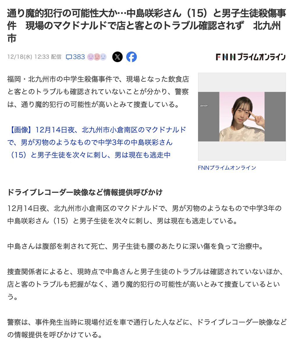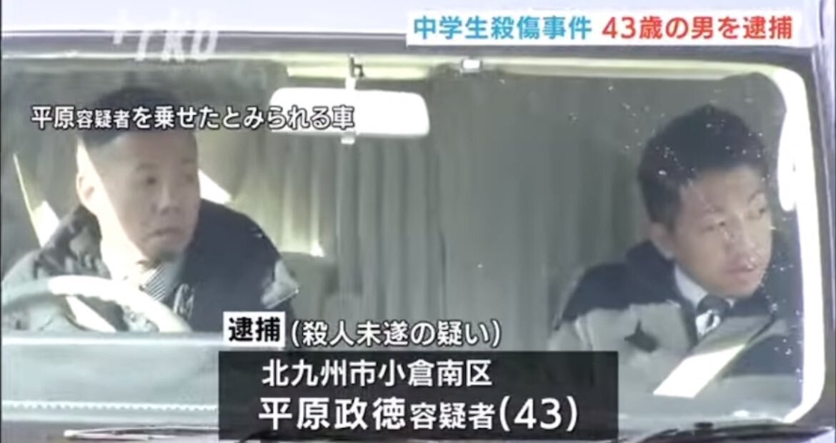 【速報】中学生2人殺傷 容疑者逮捕の決め手は「リレー捜査」防犯カメラやドラレコ映像百数十件つなげて解析 福岡県警 殺人未遂の疑いで逮捕されたのは北九州市小倉南区の無職、平原政徳容疑者(43) ※無職でも学生とは体力は比較にならない! #容疑者逮捕の決め手 #心神喪失 #精神疾患 pic.x.com/ghn2MKxLO6
