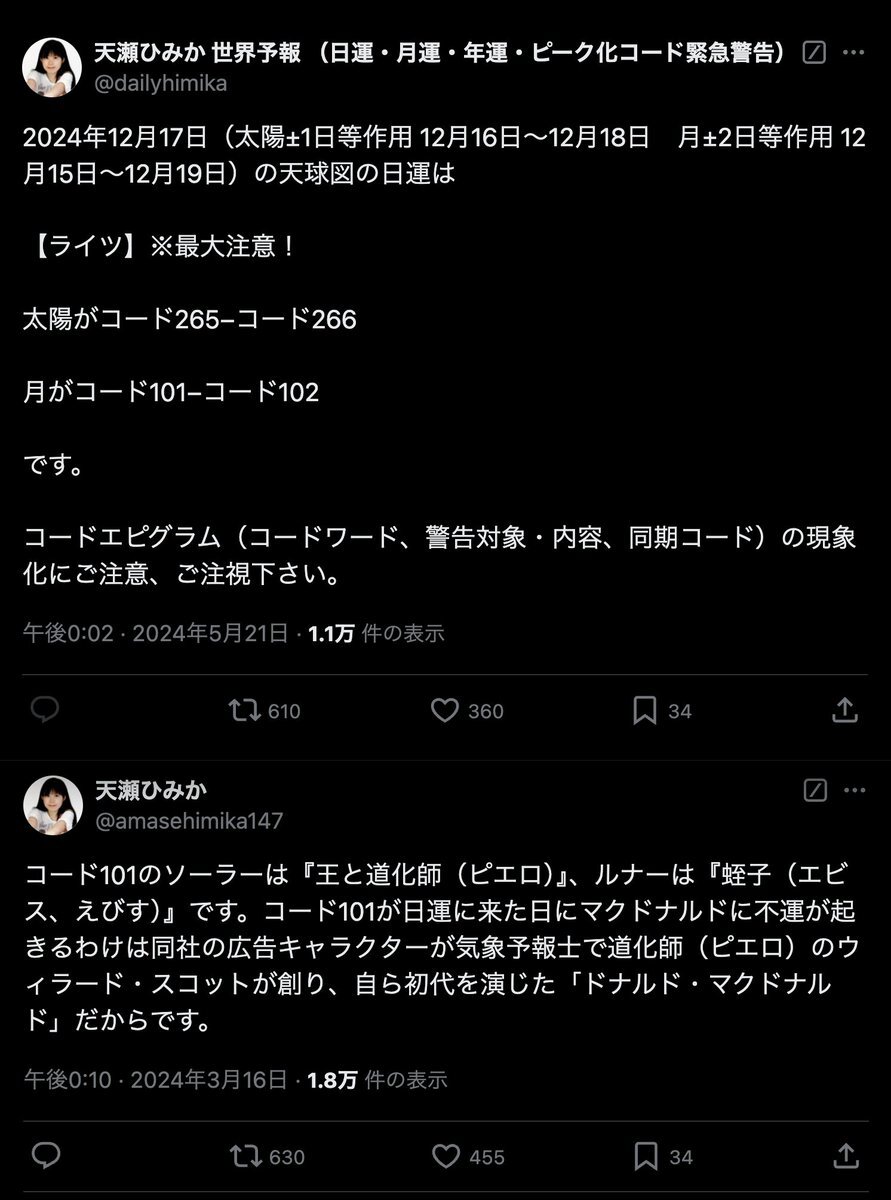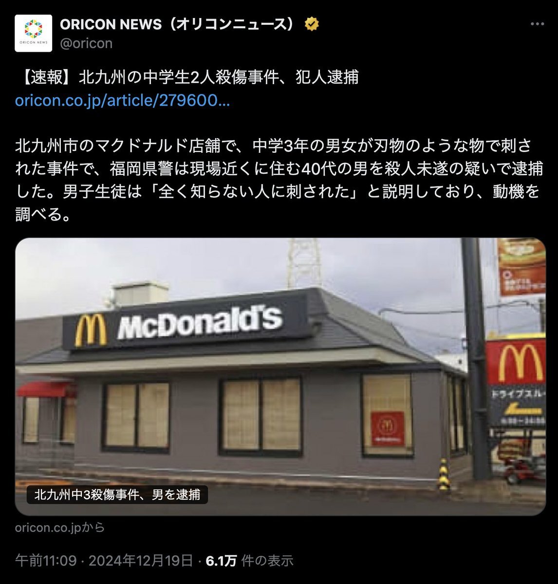 12月19日 日運 コード101「マクドナルドに不運」 【マックの犯人逮捕】 北九州 中学生2人殺傷事件 近くに住む40代の男を逮捕 中学3年の男女2人が刺され、女子生徒が死亡した事件の犯人がきょう逮捕されました。 x.com/nhk_news/statu… 事件があった14日夜もコード101の隣接強影響日でしたね。 pic.x.com/gVSZ1zrWnT