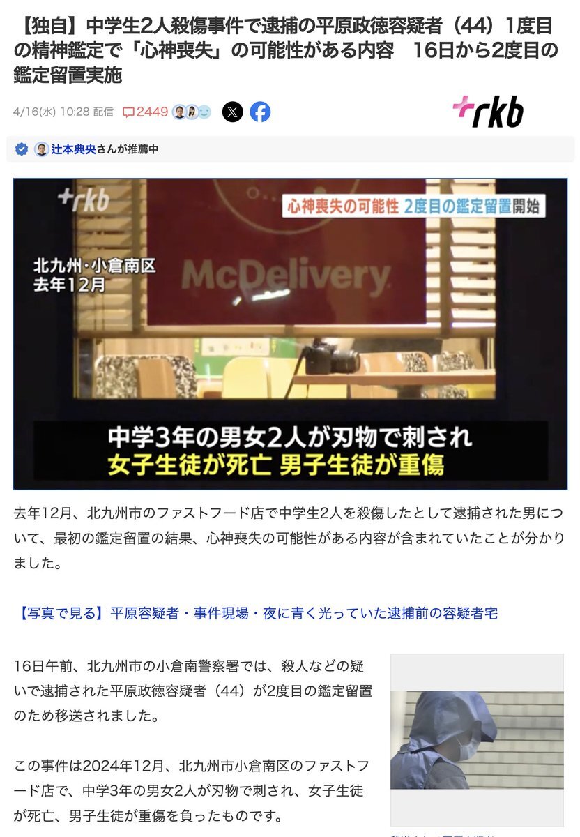 4月16日 コード196「心神喪失」 【独自】北九州市マック中学生2人殺傷事件で逮捕の平原政徳容疑者(44)1度目の精神鑑定で刑事責任能力ない「心神喪失」の可能性がある内容 16日から2度目の鑑定留置実施 x.com/YahooNewsTopic… 下手したら無罪。少年法にしてもこれにしても日本の法律はおかしい pic.x.com/PRiuBGylJQ