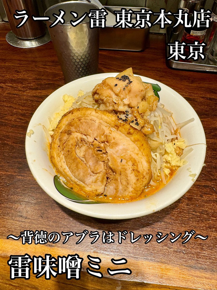 #ラーメン雷東京本丸店 雷味噌ミニ バラ肉ニンニク野菜ちょい増し 中華蕎麦とみ田の二郎系ブランド 東京駅の中にあります オープン当初ぶり相変わらず混んでます アブラは野菜のドレッシング ワシワシ極太麺 トロミのある甘めの味噌スープ クタ野菜良い バラ肉デカいなぁ ごちそうさまでした pic.x.com/V1vmLOefvJ
