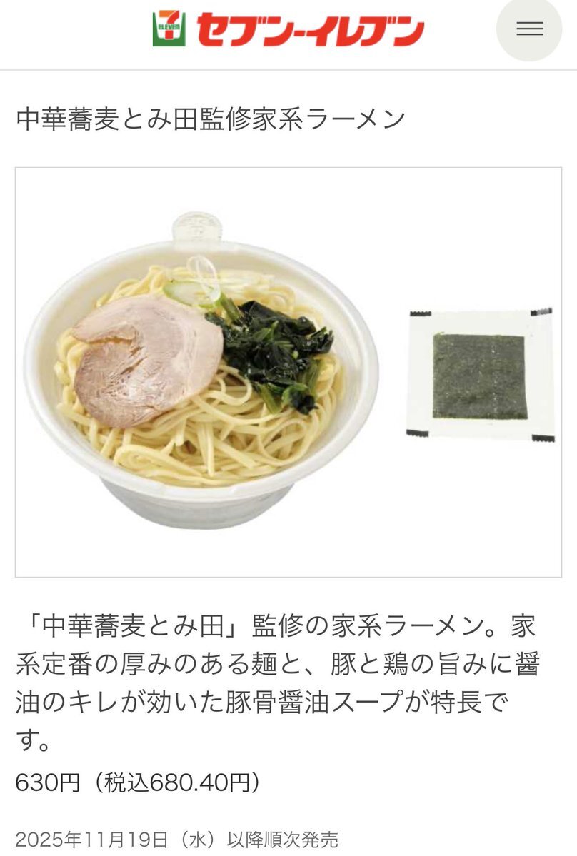 中華蕎麦とみ田 監修 @tomitahonten 家系ラーメン 待望のとみ田さん監修の家系ラーメンが 本日よりセブンイレブンにて販売開始🍜 @711SEJ 後ほど実食したいと思います🙋♂️ pic.x.com/aCSUvmW8ai