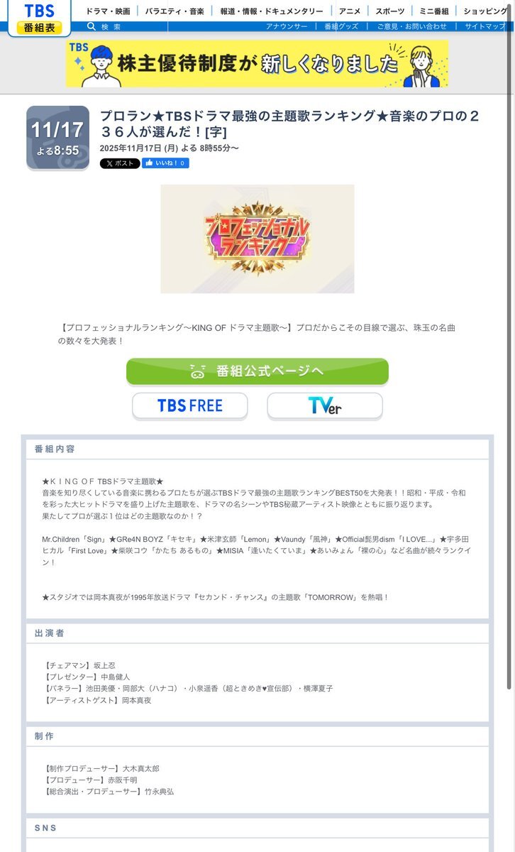 「その道のプロが選ぶ本当のNo.1 プロフェッショナルランキング」 ▽TBSドラマ最強の主題歌ランキングBEST50 #ROOKIES #恋はつづくよどこまでも #義母と娘のブルース tver.jp/episodes/epp0c…