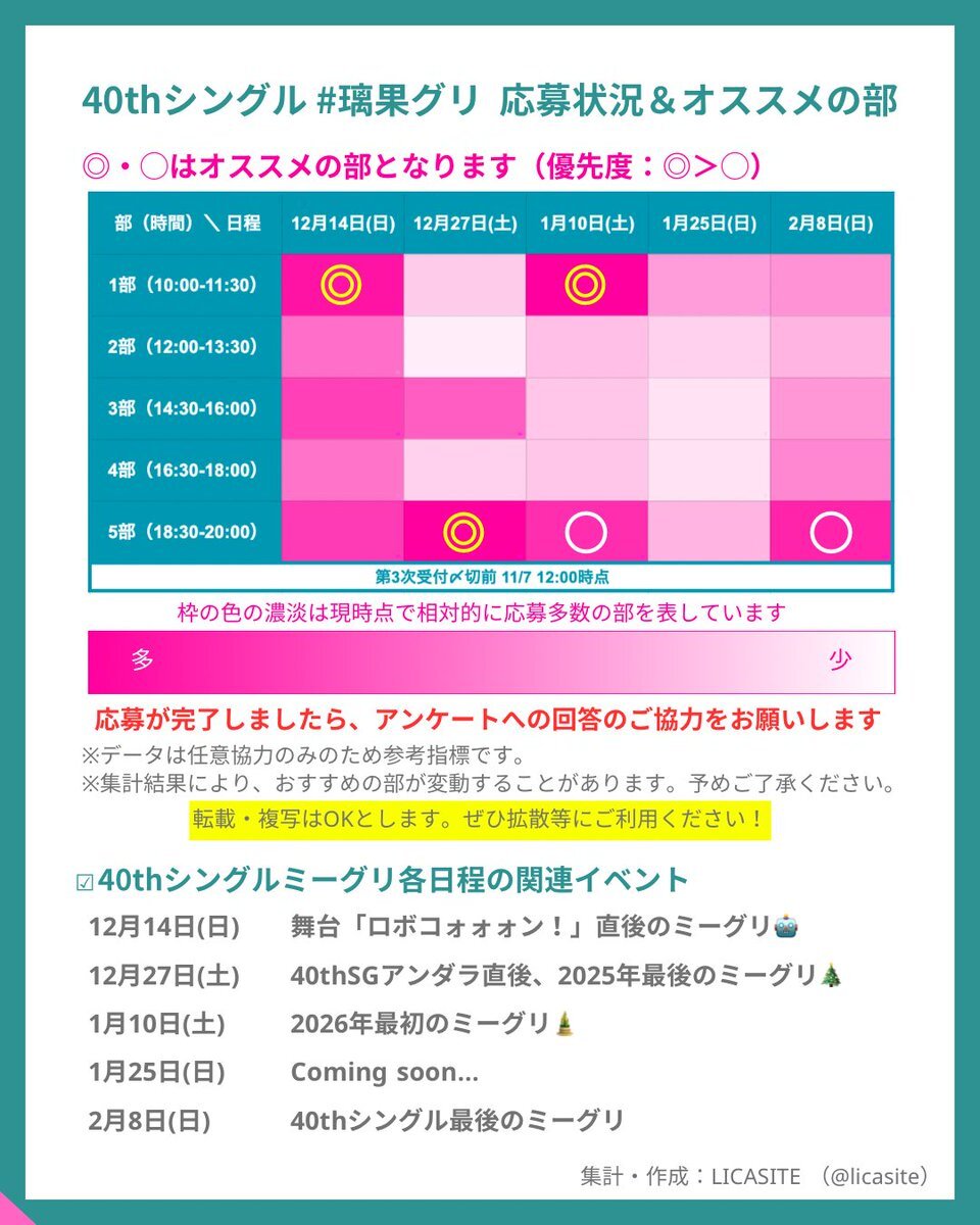 / #乃木坂46 40thSG #ミーグリ 第3次受付 本日14時まで!まもなく〆切⚠️ \ #佐藤璃果 さんとのミーグリ ✅本日12:00時点での応募状況です 応募完了”後”は、アンケートへの回答にご協力をお願いします🙇♂️ #璃果グリ お待ちしております🎀 《30秒で簡単匿名回答 💫》 🔗docs.google.com/forms/d/e/1FAI… x.com/licasite/statu…