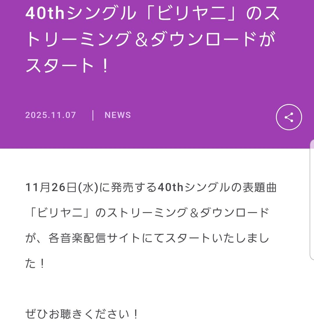 40thシングル「ビリヤニ」のストリーミング&ダウンロードがスタート!のお知らせありがとうございます😊 聴きました。 #乃木坂46 #乃木坂46_ビリヤニ x.com/nogizaka46/sta…