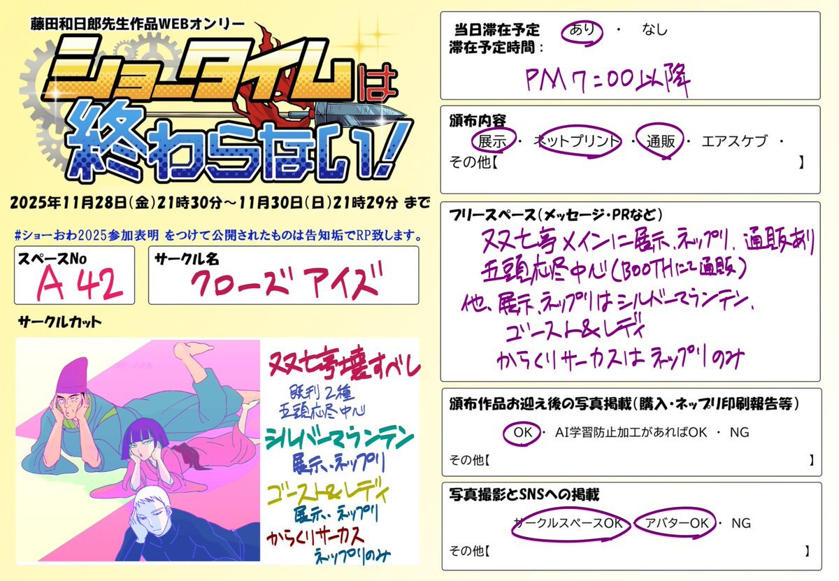 #ショーおわ2025参加表明 A42. サークル名クローズアイズ 双亡亭壊すべし(五頭応尽中心)の既刊通販、展示、ネップリ、他展示、ネップリはシルバーマウンテン、ゴースト&レディ、ネップリのみからくりサーカス 二次創作漫画、絵中心 pic.x.com/XXUbIQ7BIL
