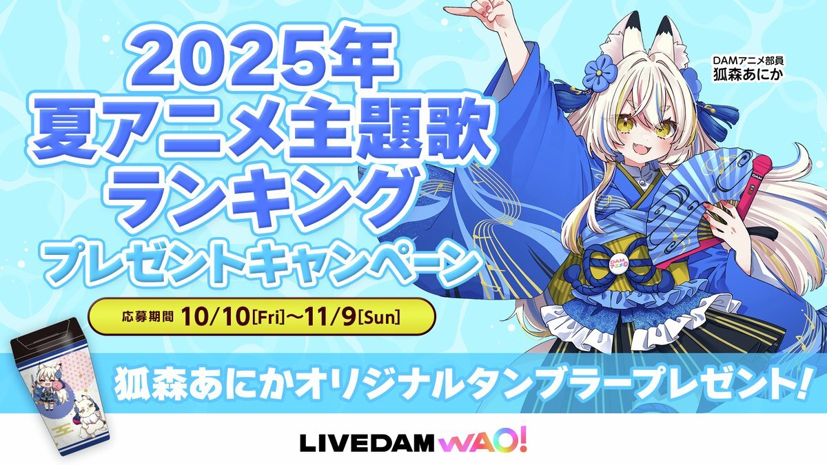// #DAM2025年夏アニメ主題歌ランキング 歌唱キャンペーン本日スタート🎁 \\ ランキングはチェックしてくれた🤗❔ TOP50のアニソンを歌うと 狐森あにかオリジナルタンブラーが 抽選で30名様に当たる🦊✨ #DAM でアニソン歌って応募してね🎤 締切:11/9(日)⏰ 👩‍💻詳細 clubdam.com/campaign/colla…