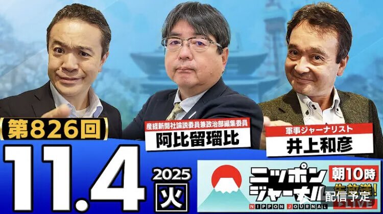 11月4日 #ニッポンジャーナル #支持率上げてやる 「高市内閣の支持率82%!/北朝鮮に伝達"首脳会談の意向"」 阿比留瑠比さんと 井上和彦さんが国内外の最新ニュースを解像度高く徹底解説! 9時50分からフライングスタート▶️ 👇 youtube.com/live/AoQRYykO9… @YouTubeより pic.x.com/iXZ2obogd6