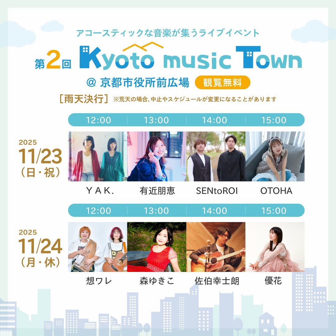 【ビラ公開】 2025年11月23日(日・祝)・24日(月・休)、京都市中京区にある町中の広場「京都市役所前広場」で開催する音楽イベント 「第2回 Kyoto music Town」 のビラが公開されました。 アコースティックな音楽が集うライブイベントです。 2日間で8組のアーティストにご出演いただきます。