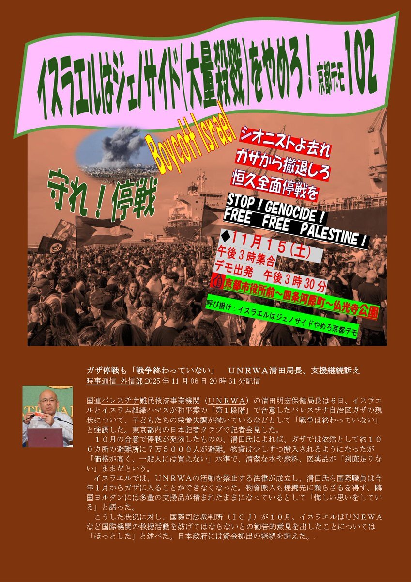 【イスラエルはジェノサイドを(大量殺戮)をやめろ!デモ】102 STOP! GENOCIDE! FREE! FREE! PALESTINE! ◆日時:2025年11月15日(土)  午後3時集合 午後3時30分出発 ◆集合場所:京都市役所前 ◆呼びかけ:パレスチナの平和を求める会・京都 facebook.com/events/1057117… pic.x.com/4OlJQG8FFc