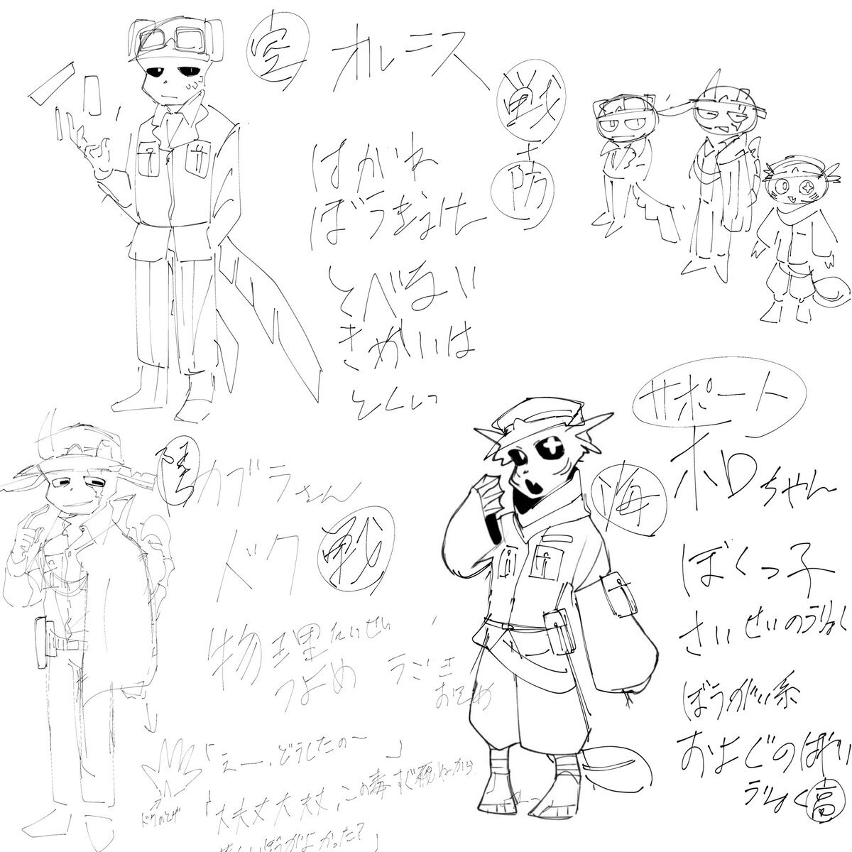 設定ネリネリネリネしてますが、簡単に言うと、 オルニスは基本無口で人と関わるのが苦手戦闘能力は中くらい カブラさんはマイペースだけどベテランって感じで淡々とこなす戦闘能力かなり高め ホロちゃんは明るいけど他人にあんま興味ない感じ戦闘能力そこそこだけど逃げ足はピカイチ相手の妨害が主 x.com/kege_c/status/…
