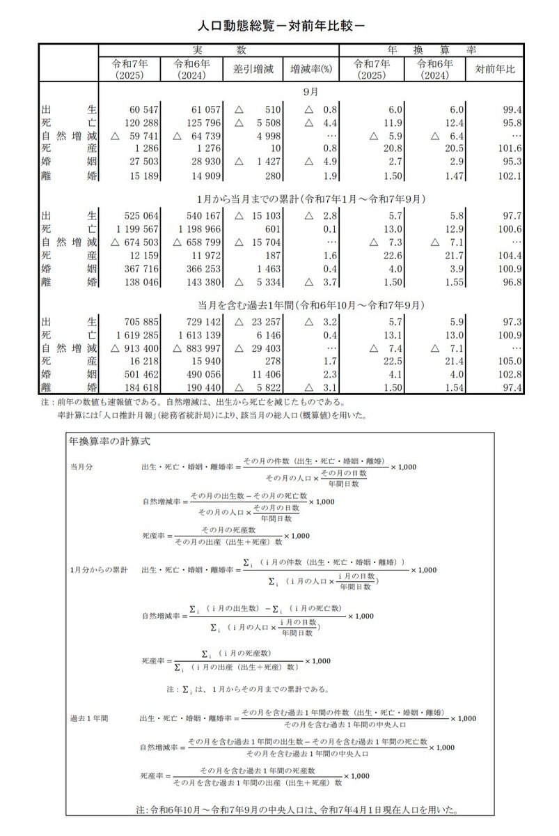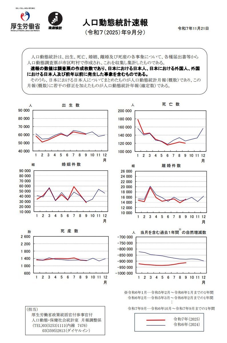 2025年11月21日(金) 厚生労働省より令和7年9月分の人口動態統計速報が発表された 8月に続き9月も死亡数が減少 #人口動態統計 pic.x.com/67i6r5csg8