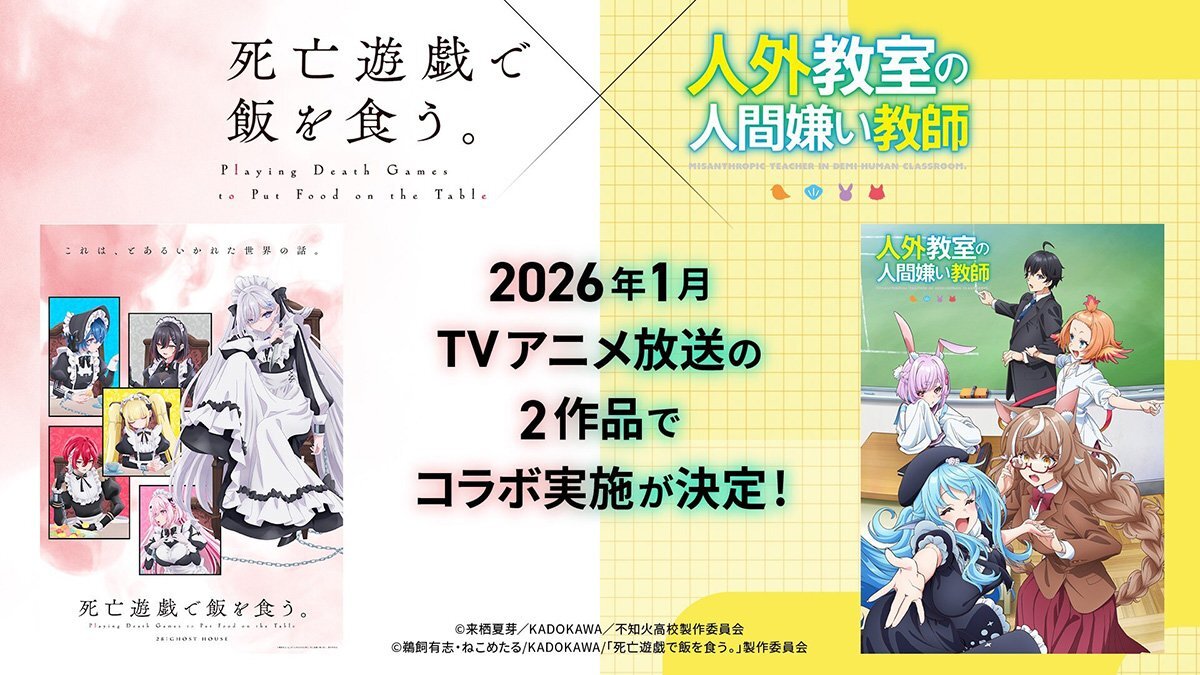 2026年1月放送開始アニメ 『人外教室の人間嫌い教師』 ■OPテーマ決定 「ニンゲン」オーイシマサヨシ ■TVアニメ『死亡遊戯で飯を食う。』とのコラボ開催が決定 (´-`).。oO(放送中にコラボ企画が実施されるようです ■追加キャスト発表 人間零:増田俊樹 水月鏡花:雨宮天 尾々守一咲:大西沙織 pic.x.com/t6XZakO8IW