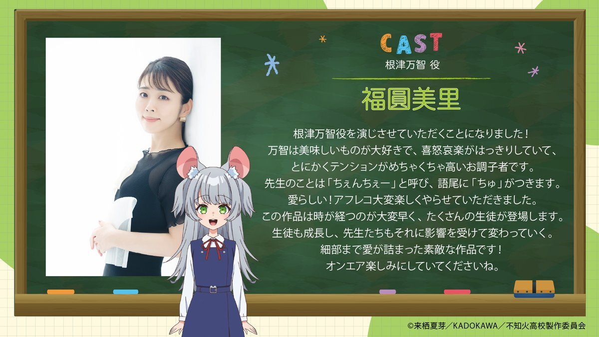 🏫キャストコメント公開🏫 美味しいものを食べることが大好きな、ネズミの少女🐭根津万智役が #福圓美里 さんに決定! キャストコメントをお寄せいただきました✏️ TVアニメ『人外教室の人間嫌い教師』2026年1月放送開始📺 #人外教室 jingai-kyoshitsu-anime.com/staffcast/