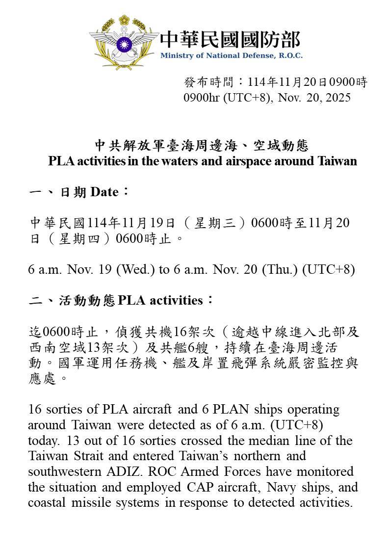 16 sorties of PLA aircraft and 6 PLAN vessels operating around Taiwan were detected up until 6 a.m. (UTC+8) today. 13 out of 16 sorties crossed the median line and entered Taiwan’s northern and southwestern ADIZ. We have monitored the situation and responded.