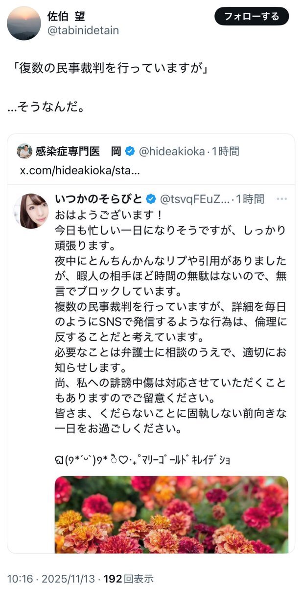 返信先:@risingsun3588こちらこそ有難うございます☺️私如きが長く陰湿なストーカーされる意味がわからなかったけど、やっぱり推しがされてきたんですね。連盟も把握しながら動かない問題が解決することを心から祈ります。 団長さん、今後ともよろしくお願いいたします🙇団長さんも元気に良き水曜日をお過ごしください🙌🏻