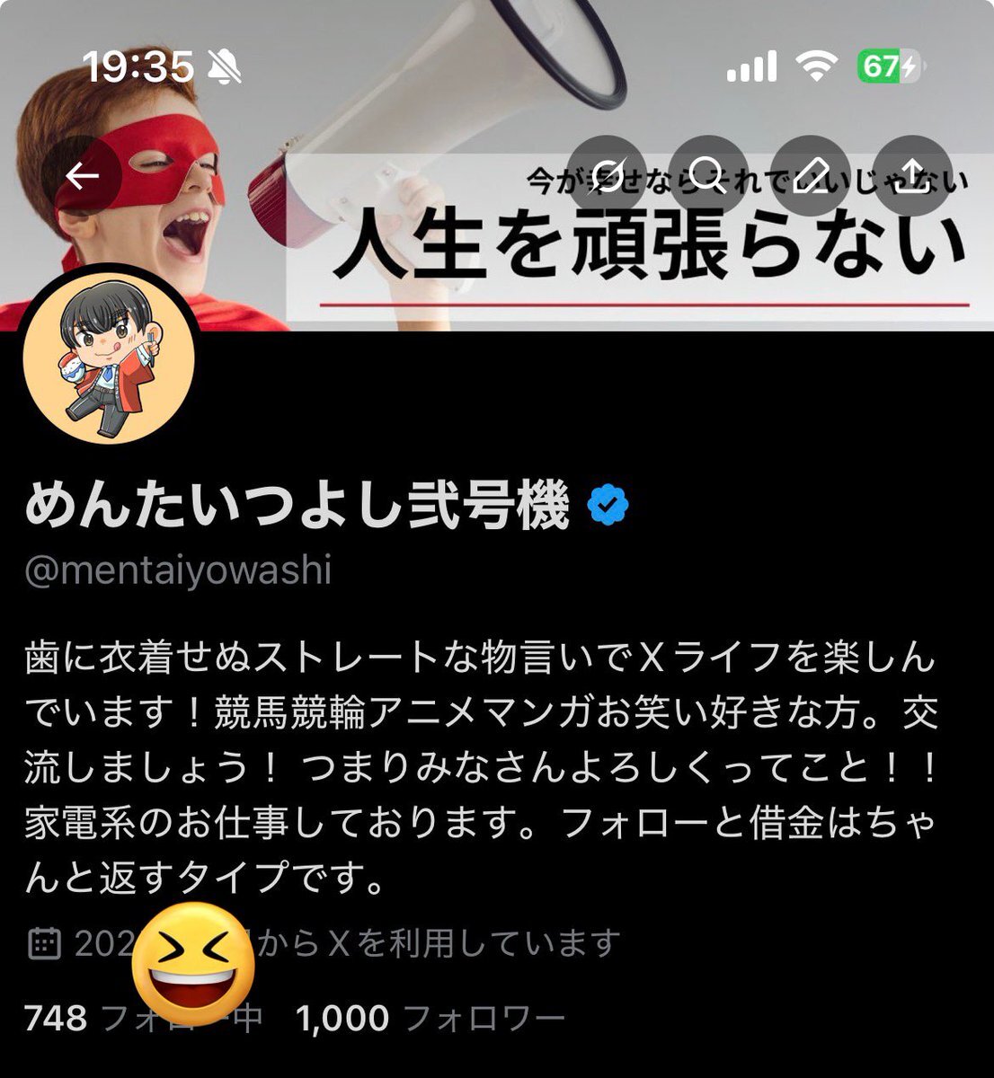 みなさまのおかげで区切りの 1000フォロワー達成出来ました。 意味もなく尖って厨二病が治らないおじさんですが、今後ともよろしくお願いします。 意味不明なリプライも多く散見され、笑いのセンスが違うと思うとすぐミュートしちゃいますが、大目に見てやってください!!! pic.x.com/7spBZiDuRL