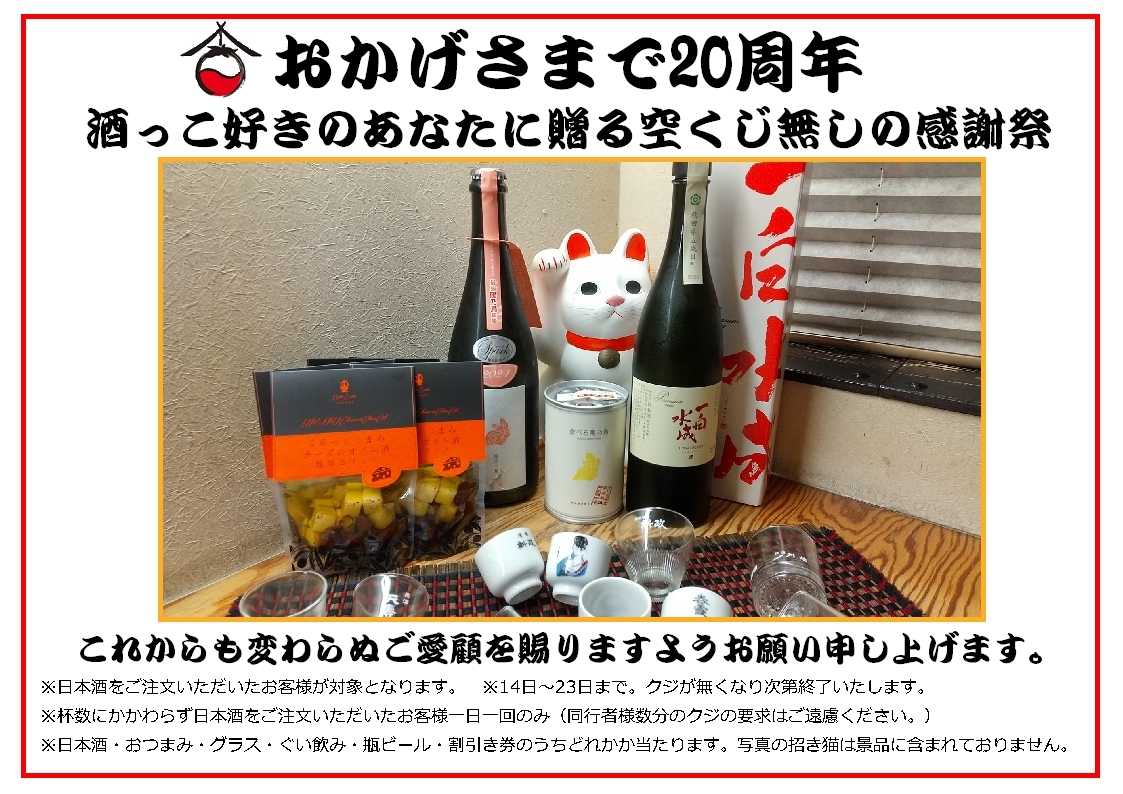 ありがたいことに本日14日で20周年を迎えることができました ささやかながら景品付のクジ引きを本日~23日までの間ですが実施いたします ※景品が日本酒に関係するものなので日本酒を嗜まれたかた限定となります🙇 今後とも変わらぬご愛顧を賜りますようお願い申し上げます🙇♂️🙇♀️ pic.x.com/d5LkpiT7co