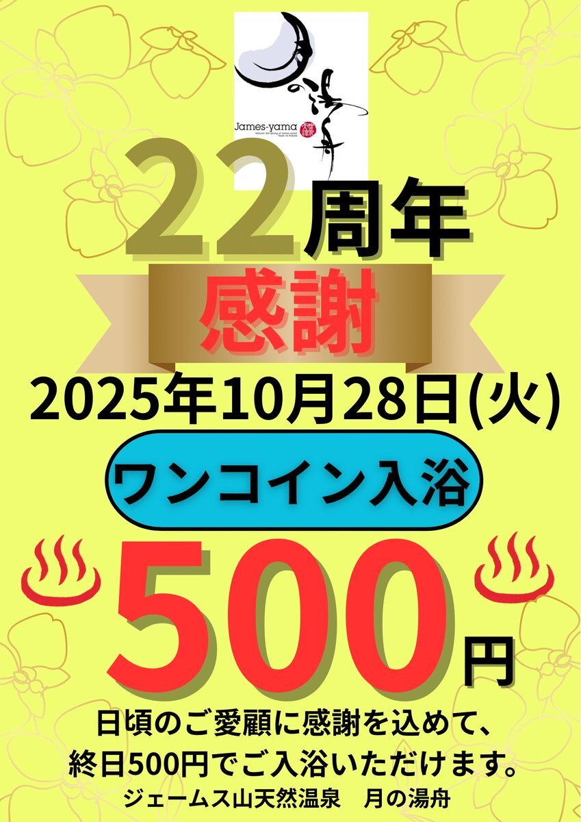 おはようございます♪ 月の湯舟🌙です♨️ 本日、10月28日、 皆様のおかげで、 このたび22周年を迎えることになりました🎊 皆様の毎日の疲れを癒す場所として、 これからも皆様を お迎えできるよう精進してまいります。 今後とも変わらぬご愛顧を賜りますよう、 お願い申し上げます。 pic.x.com/jw6tOek9SH