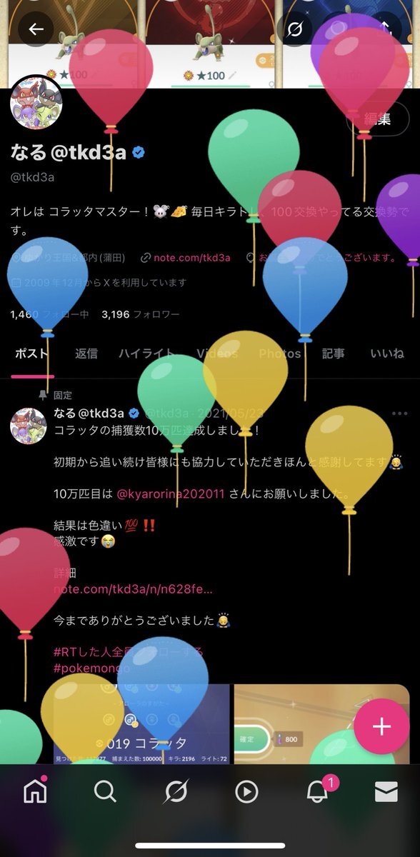 風船飛びました🎈 いつも仲良くさせて頂いてる方々、コラッタ頂いてる方々、キラトレご協力頂いてる方々ありがとうございます🙇♂️ 今後とも宜しくお願いします🙇♂️ ネクロズマお疲れ様でした。 誕生日色100はならず💦 終わった後に博士の40万バトル&400万捕獲と合わせて打ち上げ🍻 ご馳走様でした🙇♂️ pic.x.com/0riM53xcUc