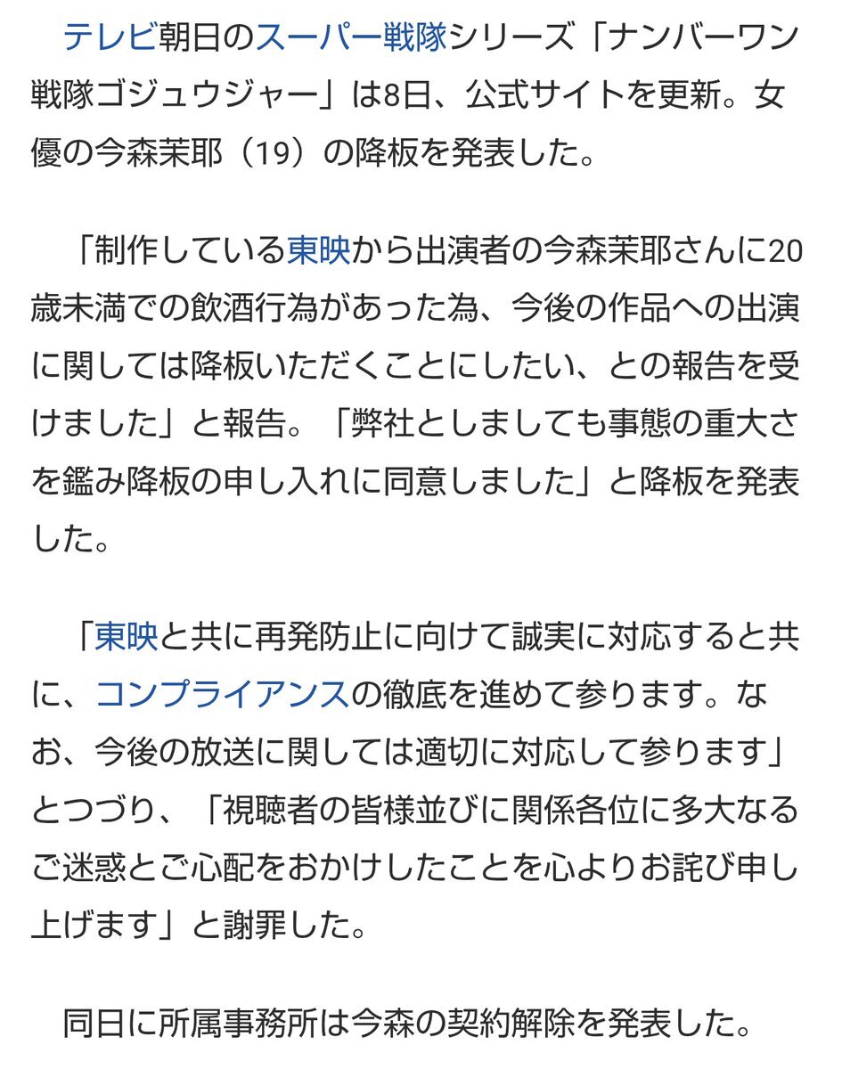 【発表】テレ朝「ナンバーワン戦隊ゴジュウジャー」今森茉耶の降板を発表 news.livedoor.com/article/detail… 今森について東映から「20歳未満での飲酒行為があった為、今後の作品への出演に関しては降板いただくことにしたい、との報告」があり、「事態の重大さを鑑み降板の申し入れに同意しました」と伝えた。