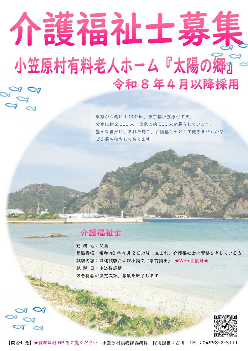 【令和8年度採用】 《介護福祉士》募集中!! ○受験資格:昭和40年4月2日以降に生まれ、介護福祉士の資格を有している方 ○選考日:申込受付後調整 ★試験はWeb面接と小論文(申込時提出) ★職員住宅完備 ぜひ村HPをご覧ください⇒職員募集 | 小笠原村公式サイト (vill.ogasawara.tokyo.jp) pic.x.com/jPQZOT754o
