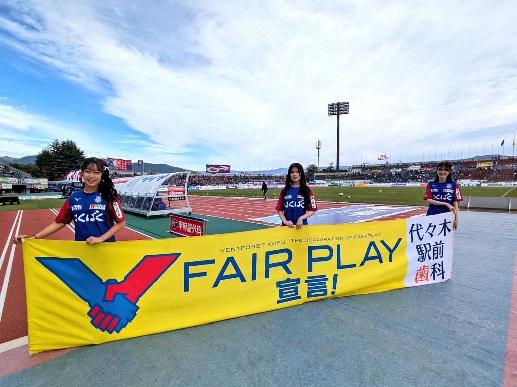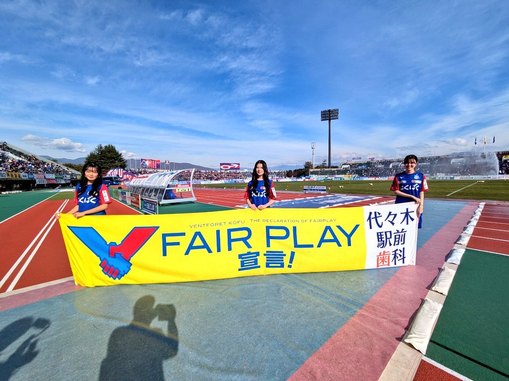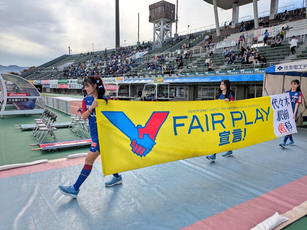 11/2 #甲府水戸 𝑭𝑨𝑰𝑹 𝑷𝑳𝑨𝒀☺ #代々木駅前歯科 プレゼンツ フェアプレー宣言ファミリー👪‼️ 常に #フェアプレー 🤝で共に熱く🔥戦おう‼️ #エアコンぶんぶんお姉さん #フッキー #ふじぴょん #DAZN 📺でも応援を! bit.ly/3bLTsiu #vfk #ソコヂカラ #Unite #Jリーグ pic.x.com/ibhGMcJgvB