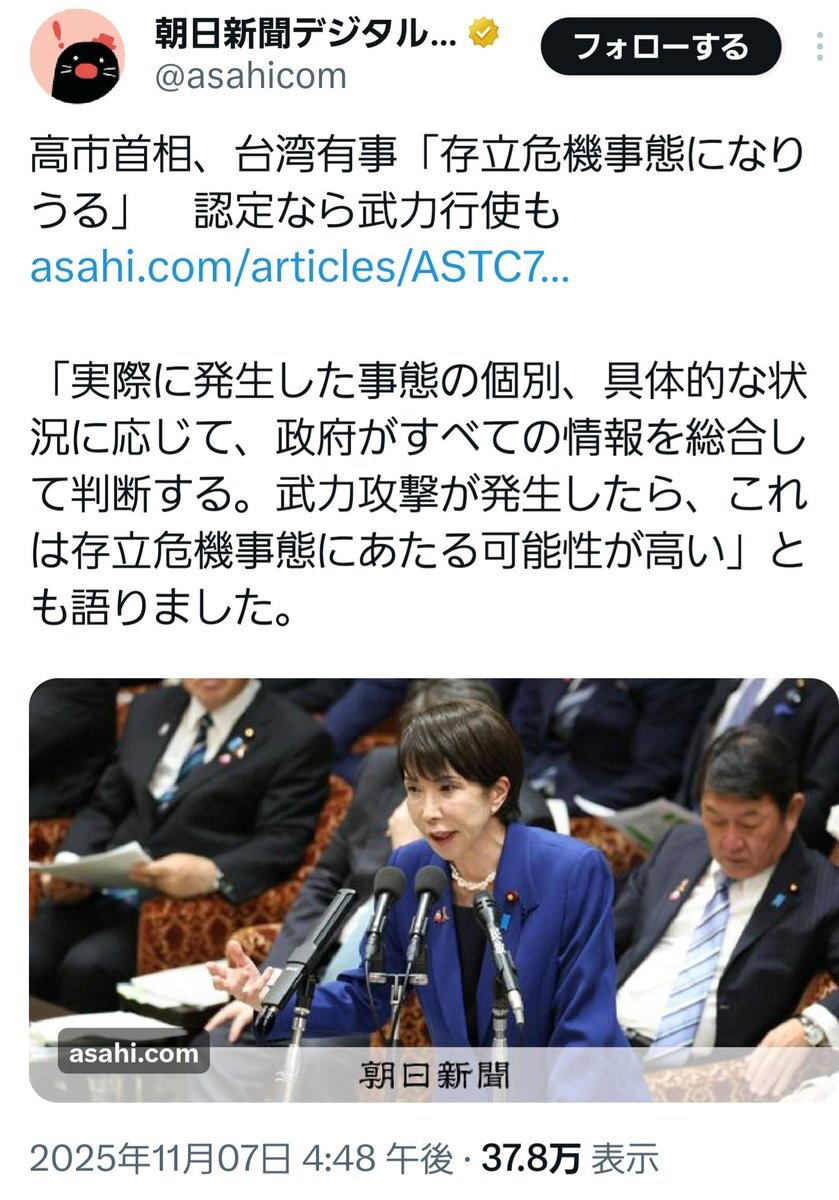 高市首相、台湾有事「存立危機事態になりうる」 認定なら武力行使も asahi.com/articles/ASTC7… 「実際に発生した事態の個別、具体的な状況に応じて、政府がすべての情報を総合して判断する。武力攻撃が発生したら、これは存立危機事態にあたる可能性が高い」とも語りました。