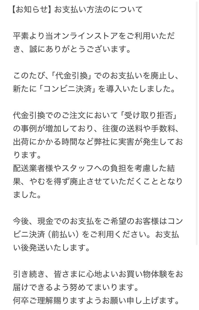 代金引換(代引き)廃止のお知らせ あまりにも代引き受取拒否が多いため廃止することになりました。 かわりにコンビニ払いを導入いたしましたので現金払いをご希望の方はコンビニ払いをご利用ください。ご不便をおかけしてしまい申し訳ありません。何卒ご理解ご了承のほどよろしくお願いいたします。 pic.x.com/NhjGDhFWat