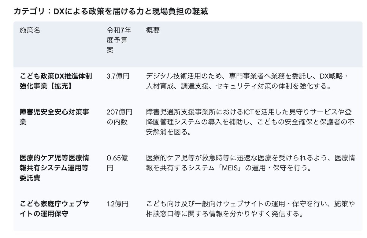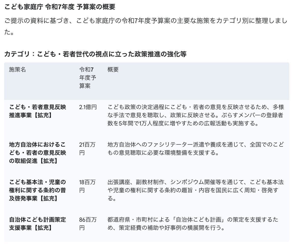 コメントありがとうございます✨ こども家庭庁の予算の細目が不明瞭とのことなので、詳細な資料を持ってきました ・令和7年度予算案の概要(事業別の資料集) cfa.go.jp/assets/content… ・それをAIでカテゴリごとに整理したもの gemini.google.com/share/ba77c945… どうぞご覧下さい👀 #ゆる自民 pic.x.com/GM0FqIXl2X x.com/Ojisama555A/st…
