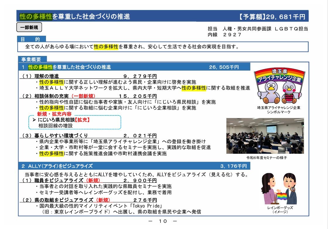 返信先:@mugityan_japanそれは令和7年度埼玉県当初予算案の概要ですね。 部局別(県民生活部)p10から、性の多様性事業の明細が書いてあります。個別にどれくらいお金がかかっているのかわかりますよ PDF pref.saitama.lg.jp/documents/2600… 別の資料のほうがもっと詳細なのですがスマホとPCで行ったり来たりしてて、まだ確認中です pic.x.com/qdAcLtPJi6