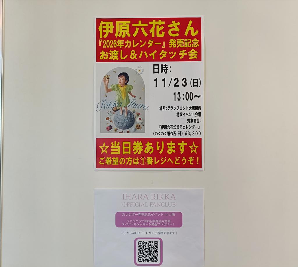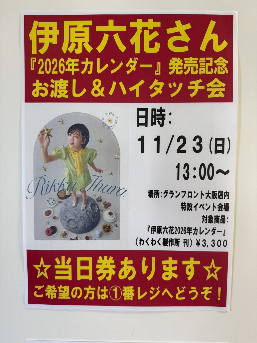 当日券の販売があります☺️ お近くの方は是非どうぞ〜🍀 #伊原六花 #りっかたん #グランフロント大阪 #伊原六花カレンダー2026 x.com/Kino_GFOsaka/s…