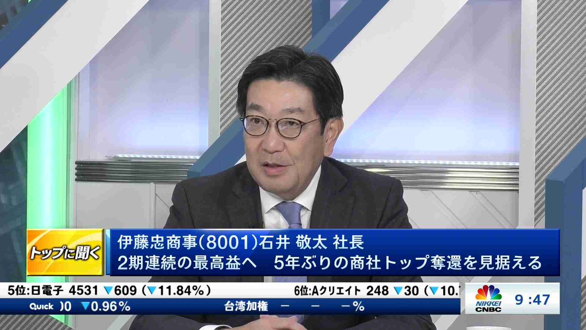 【伊藤忠商事(8001) 石井 敬太 社長 2期連続の最高益へ 5年ぶりの商社トップ奪還を見据える】「トップに聞く」のゲストは、伊藤忠商事 石井 敬太社長。成長戦略や競争環境などをじっくり聞きます。視聴は→online.nikkei-cnbc.co.jp/vod/62075 pic.x.com/KTL1mdQgXn