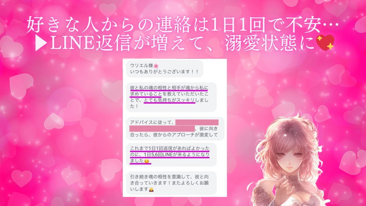 【彼からのLINEが1日1回から、1日5,6回に💖溺愛され始めてる🌸】 鑑定を受ける前は、彼からの連絡は1日1回でとても不安😥どうすればよいかわからない… 溺愛鑑定を受けたことで、 気持ちがスッキリし、アドバイスを実行してみたら、なんと彼からのLINE返信が1日に5,6回に💖 x.com/uriel_koitensh…