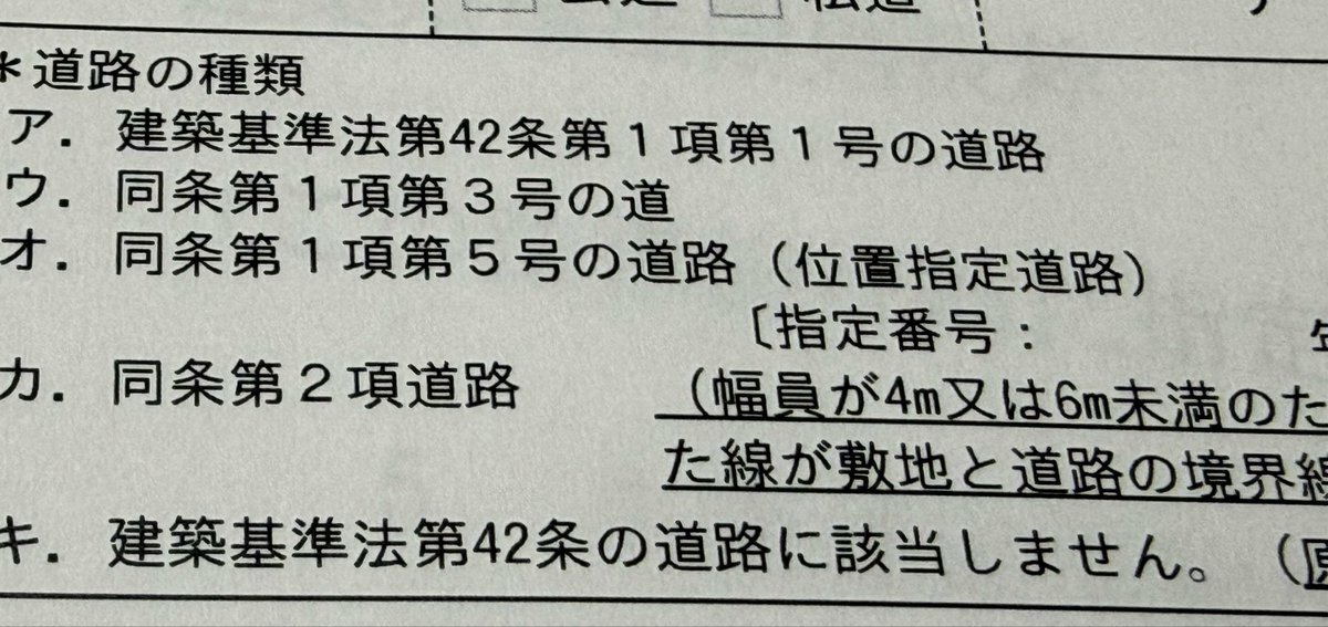 建築基準法第42条第1項第5号道路だけど、位置指定道路ではない。 これを全宅連の雛形で重説に反映させるにはどうすれば良い? pic.x.com/jiA6Zv25oo