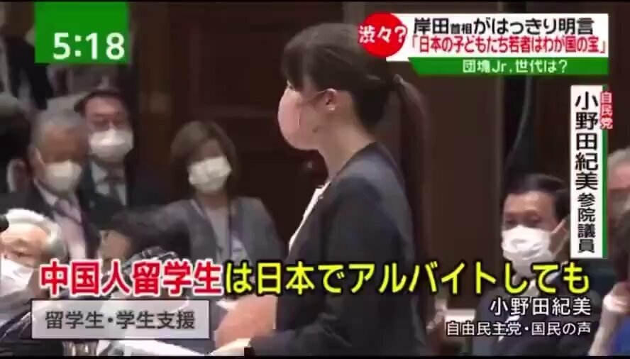 小野田紀美「中国人留学生は日本でバイトしても所得税がかかりません!日本人学生はかかります。日本人が中国に留学に行ったらバイトできませんって相互じゃない。日本人学生を大事にして頂きたい!」