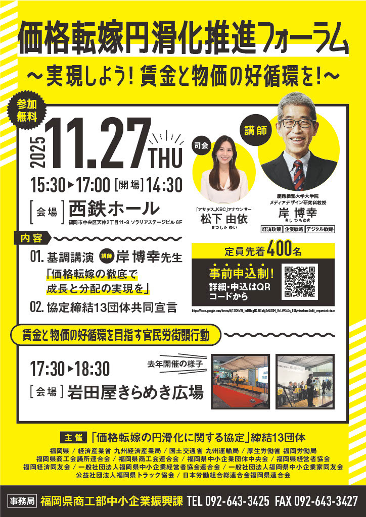 価格転嫁円滑化推進フォーラム」が 11月27日(木)15時30分から西鉄ホールで開催されます 講師:慶應義塾大学大学院教授の岸博幸さん テーマ:価格転嫁の徹底で成長と分配の実現を 申込の際、団体名「その他」を選択し「北九州商工会議所」とご入力ください ▼申込フォーム docs.google.com/forms/d/12CNh1… pic.x.com/mgaUL1sLbj