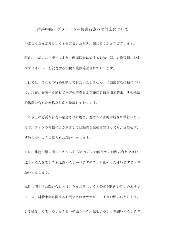 返信先:@fa7FmZxbOF49460こちらの声明だと『当社及び所属タレントに対する誹謗中傷行為その他権利侵害行為(以下、総称して「権利侵害行為」)』と書かれているので、権利侵害と誹謗中傷を分けているというより権利侵害行為の中に誹謗中傷が含まれていると読み取ったのですがいかがでしょうか cover-corp.com/news/detail/20…