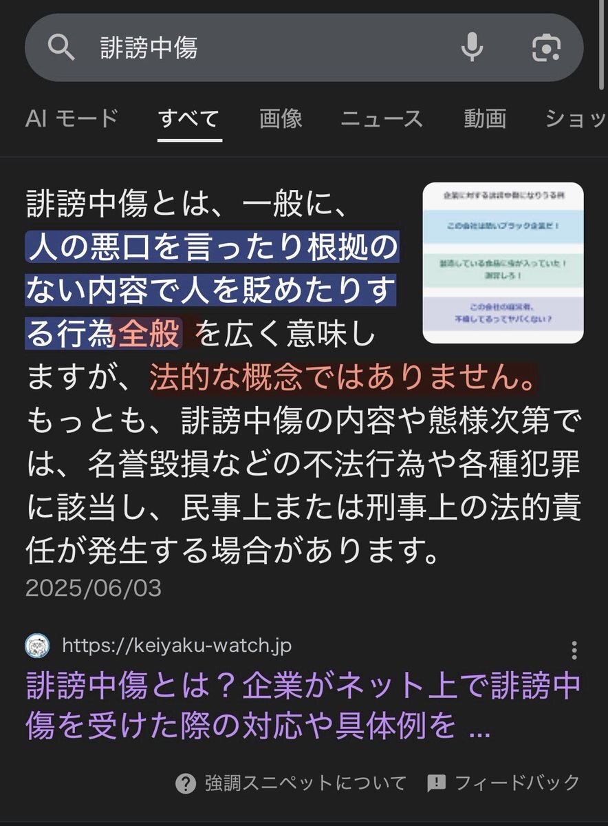 返信先:@GunshiKuniyan「誹謗中傷かどうかは司法判断」という非難を非常に多く見かけました。しかし、それは完全に誤解なんですよね。 誤った認識に基づいて大勢から非難されている現状は可哀想です😢 ⭕️誹謗中傷の中で酷いものが名誉毀損罪などの法に触れる。 ❌名誉毀損罪などの法に触れなければ誹謗中傷ではない。