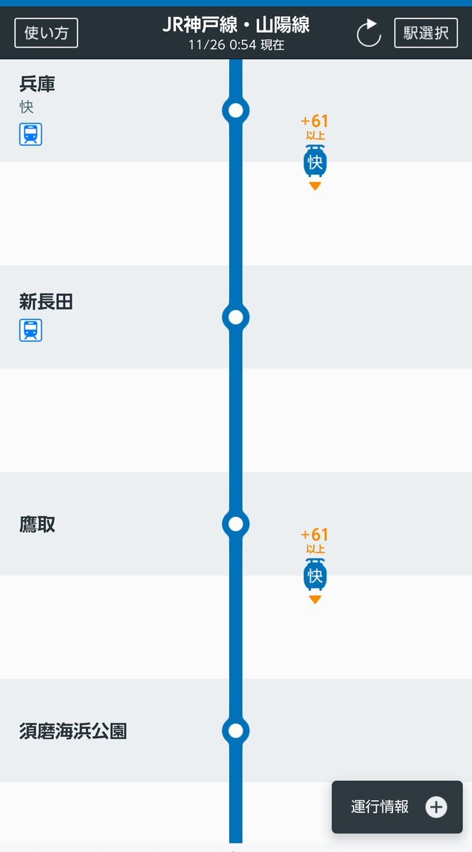 11月26日0時0分現在: JR神戸線で信号の確認を行ったため、山陽線の一部列車に約20分の遅れがでています。 #JR西日本 #山陽線 trafficinfo.westjr.co.jp/chugoku.html
