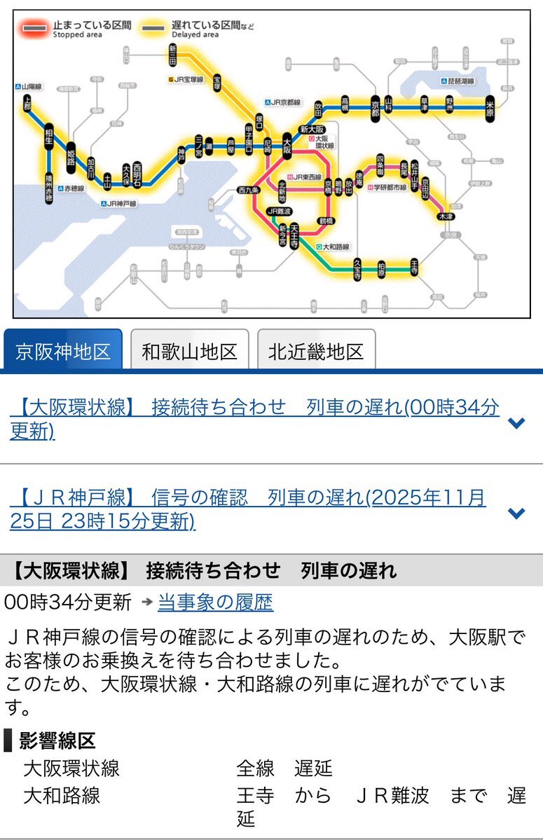 11月26日0時34分現在: JR神戸線の信号の確認による列車の遅れのため、大阪駅でお客様のお乗換えを待ち合わせました。このため、大阪環状線・大和路線の列車に遅れがでています。 #JR西日本 #大阪環状線 #大和路線 trafficinfo.westjr.co.jp/kinki.html pic.x.com/PIKWJqNt1A