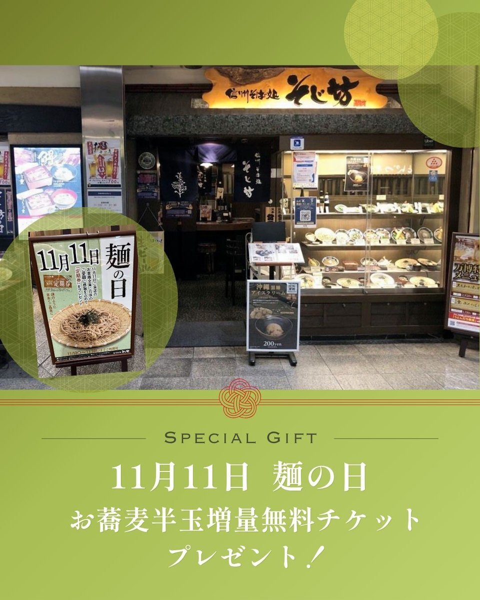 / 📢 【そじ坊】11月11日は麺の日🍜 \ 信州そば処そじ坊 店内でお食事された方へ 『お蕎麦半玉増量無料チケット』をプレゼント‼️ この機会にいつもよりちょっと贅沢に香り高いお蕎麦をお楽しみください✨ 🎁チケットはなくなり次第終了となります。 営業時間 11:00~21:30(LO.21:00) pic.x.com/Kw4zDMOIo8
